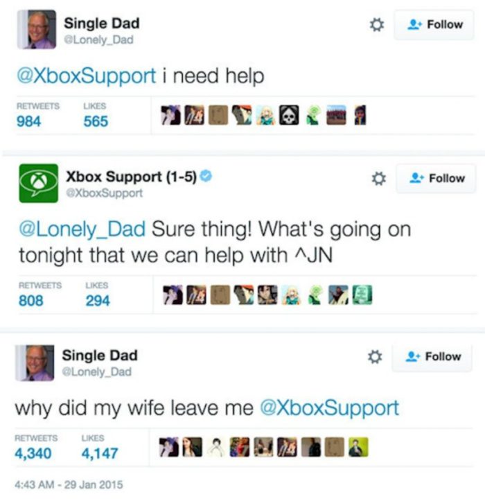 in LOL 10 Hilarious Tweets To And From UK Companies May 2, 2019, 7:00 am 3.7k Views 57shares Facebook Twitter Pinterest LinkedIn Lonely Dad Lonely Dad sure is lonely, asking Xbox support questions only a true best friend can answer! Page 4 of 10Previous 12345678910Nexttwitter What do you think? 0 Points Upvote Downvote